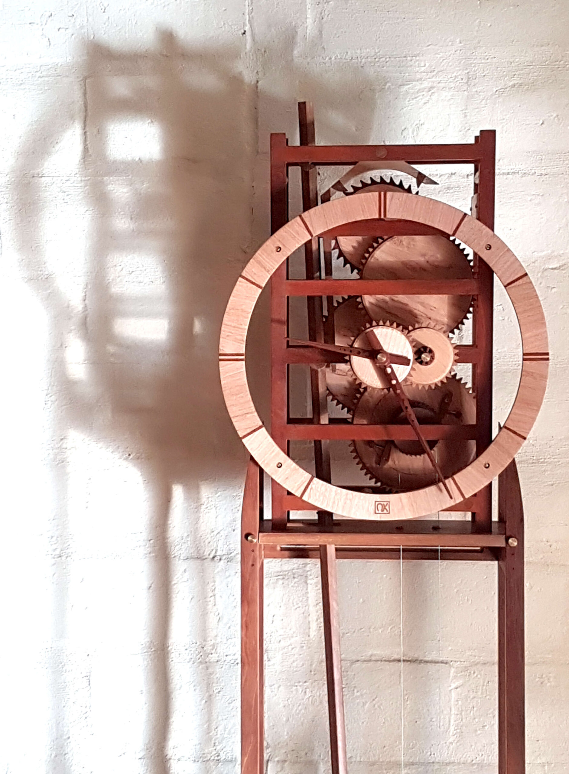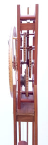 This clock keeps time to within a couple of seconds a day. The gears and palates of the escapement are made of ironbark, one of the hardest known timbers. The bearings are all stainless steel. It requires daily winding.