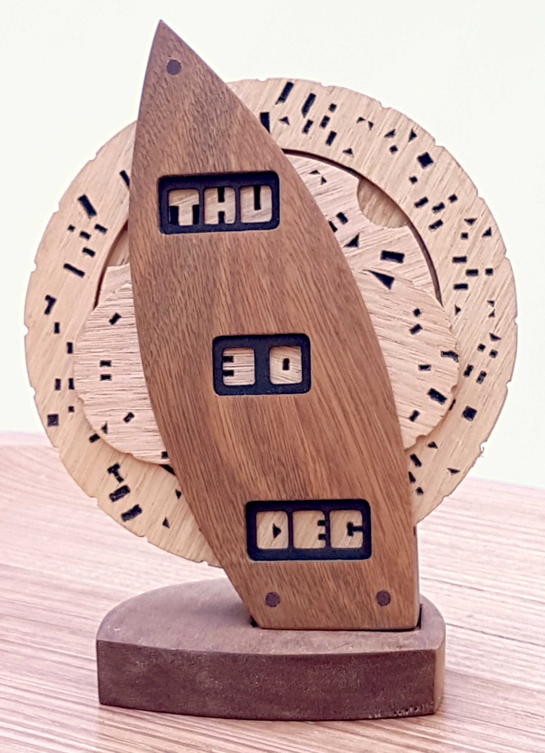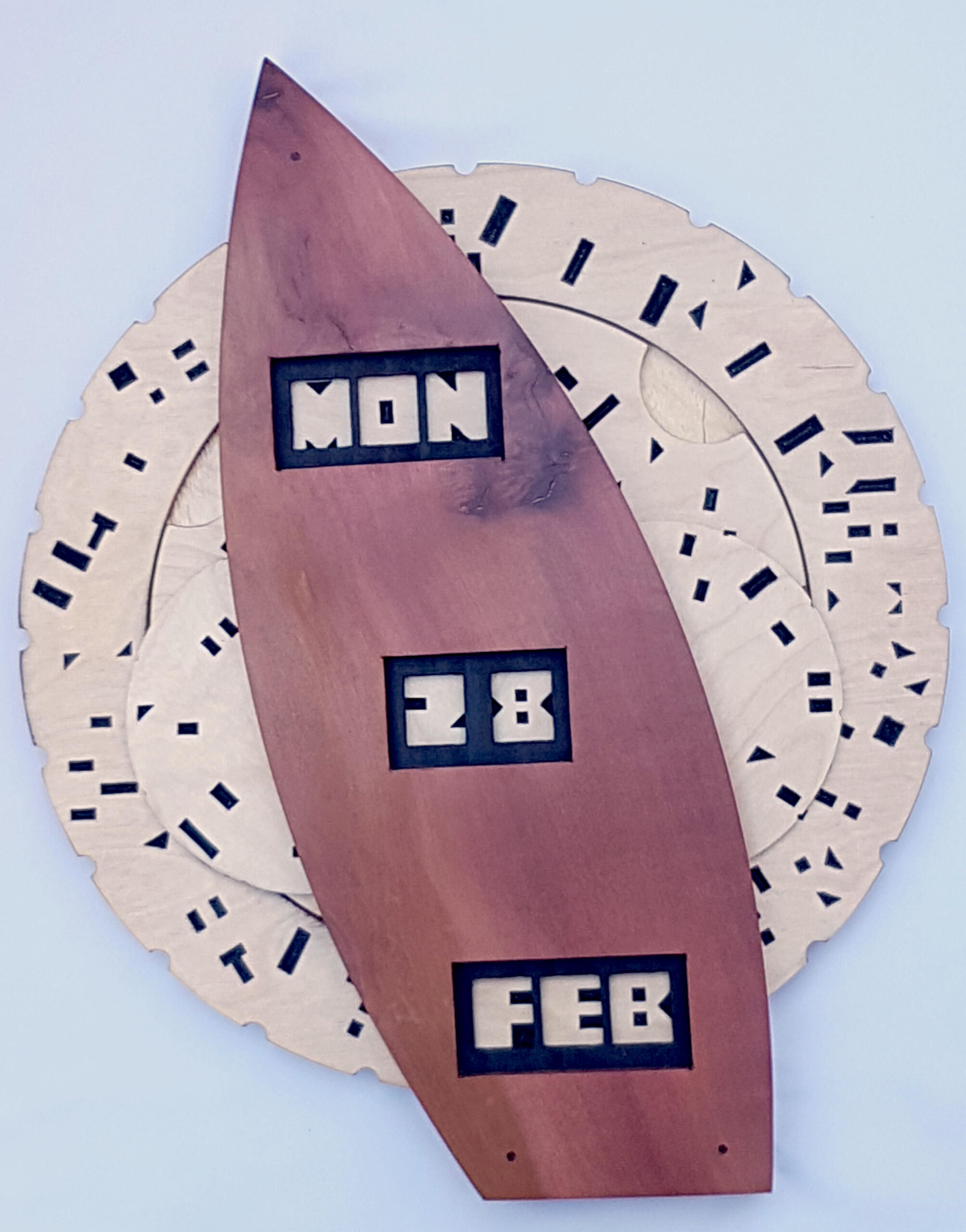 As the 3 sets of wheels are independently turned, the day, date and month are displayed. On the outside of the wheels, it looks like a series of random markings. Quite an interesting idea that I adapted to this design.