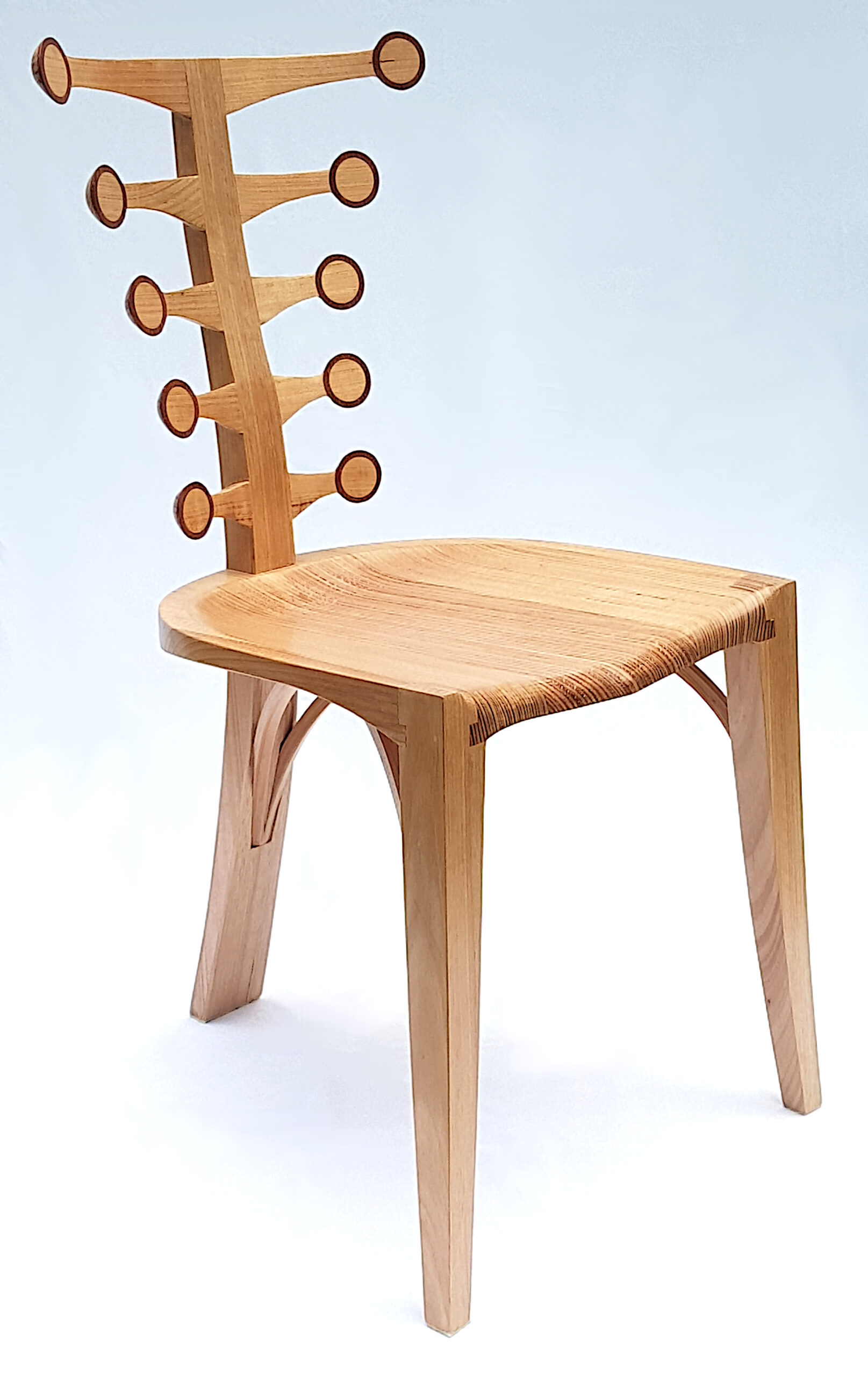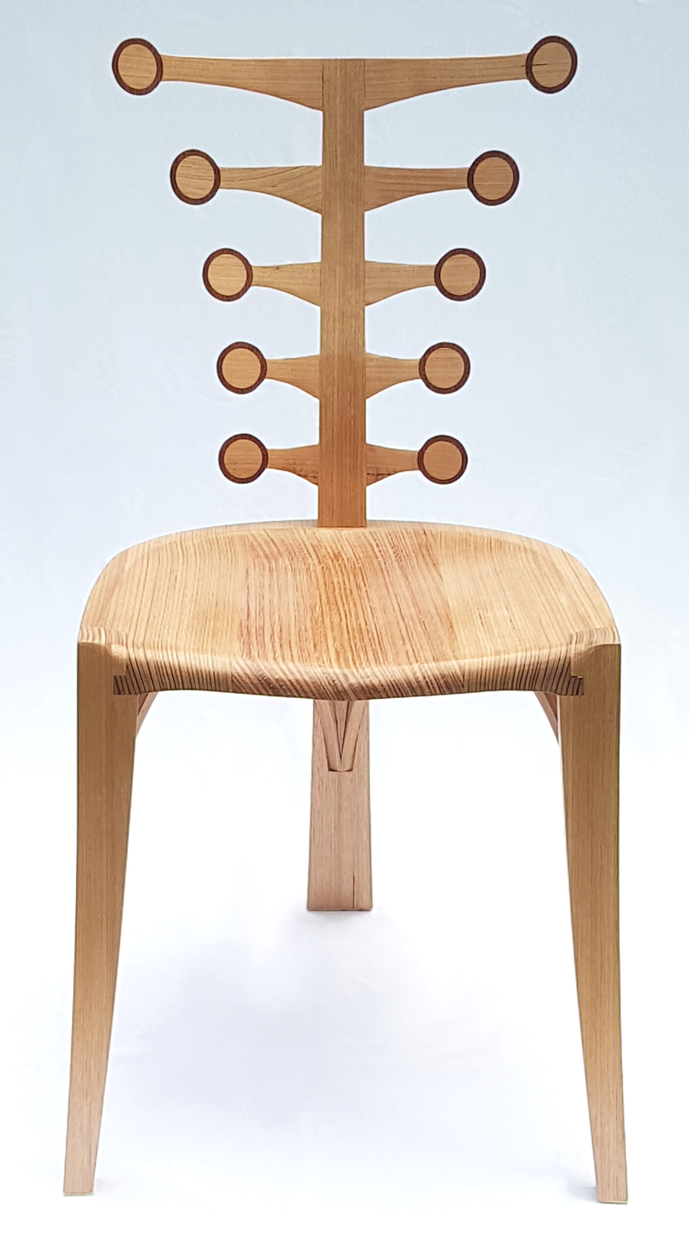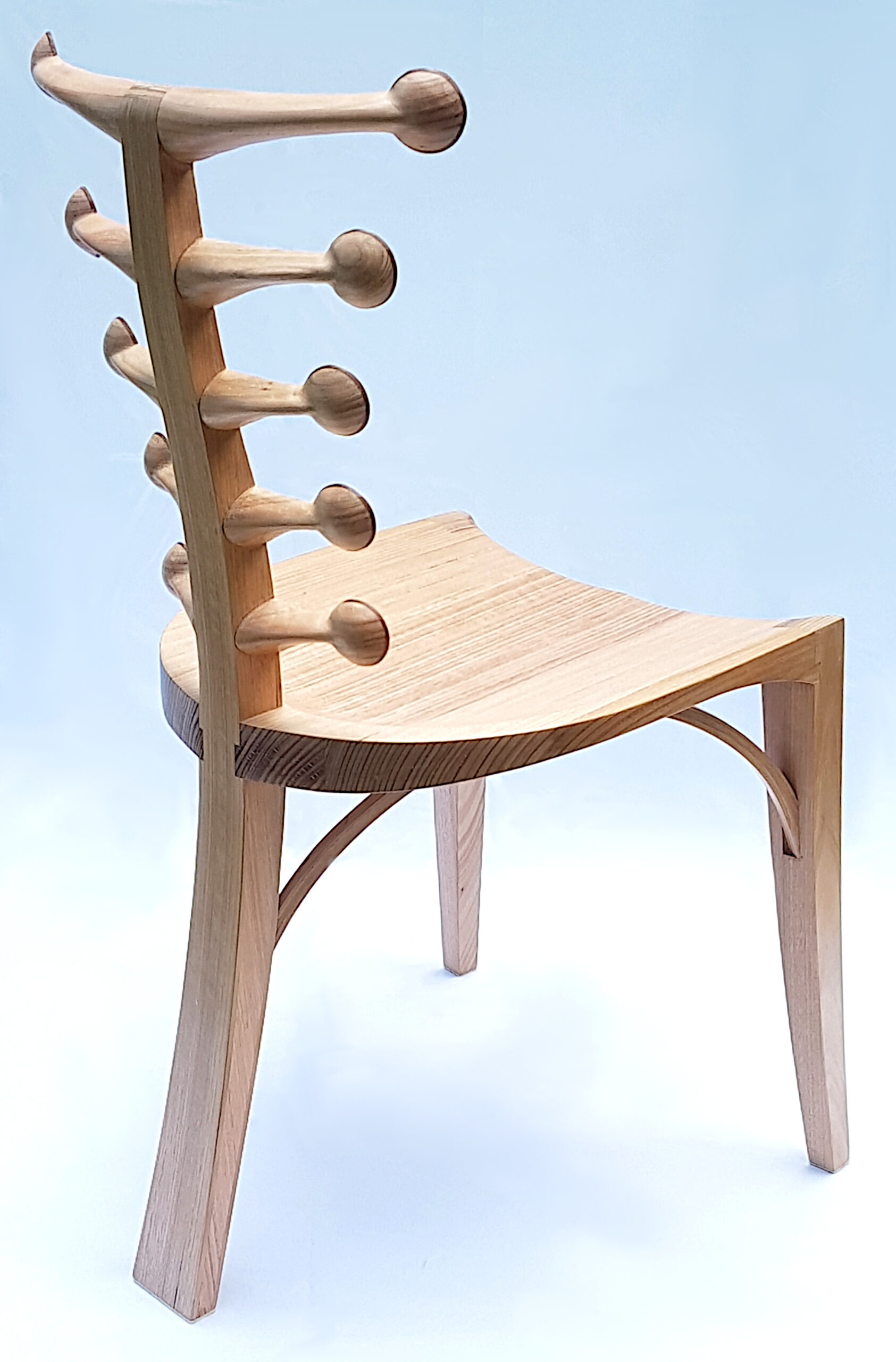 I wanted to make a 3-legged chair that has the capacity for design flexibility. The seat and legs are set whilst I can explore different back designs branching out from the central spine.