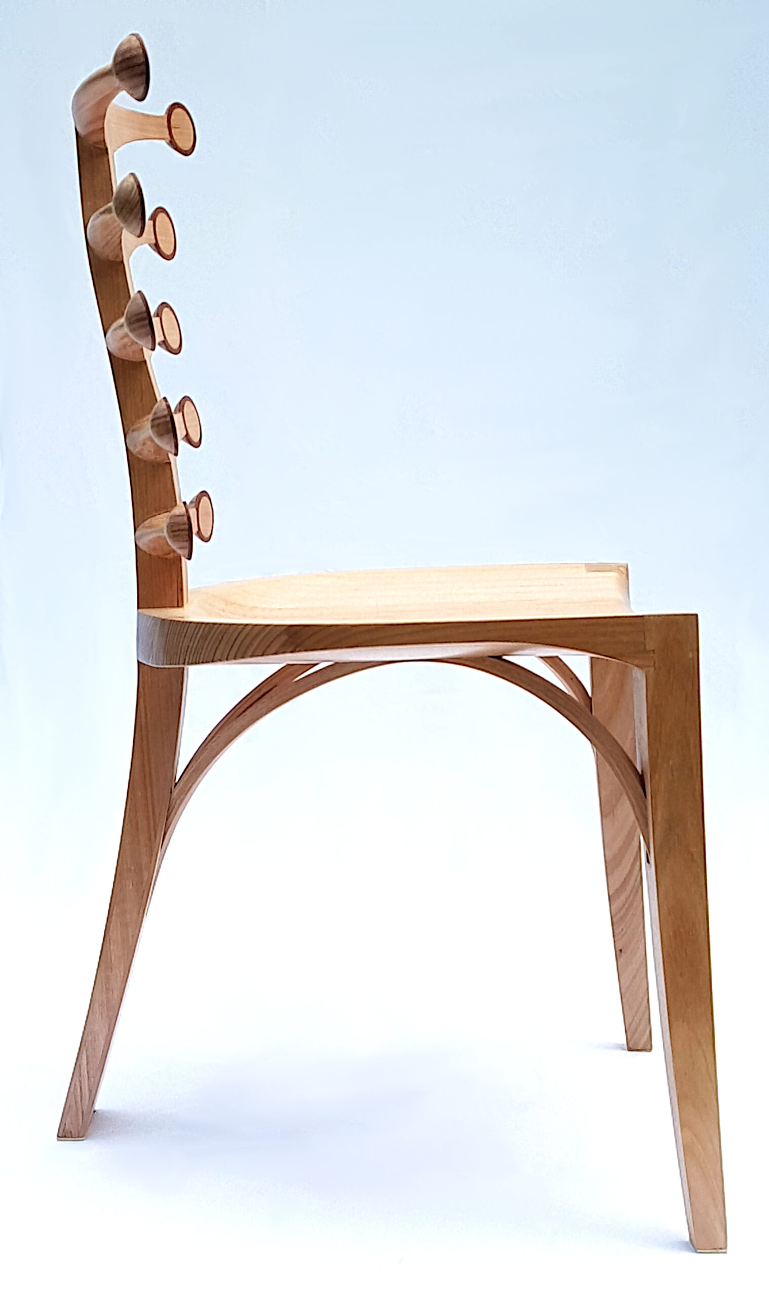 In this particular design, back arms branch out to give full seated back support. Using through tenons, the back is strong whilst remaining aesthetically light.